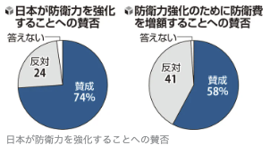 読売新聞社と公益財団法人「日本国際問題研究所」(JIIA、東京)が共同実施した全国世論調査(郵送方式)で、日本が防衛力を強化することへの賛否を聞いたところ、「賛成」との回答が74%に上り、「反対」の24%を大きく上回った。防衛力強化のために、防衛費を増額することについても「賛成」の58%が「反対」の41%を上回った。
