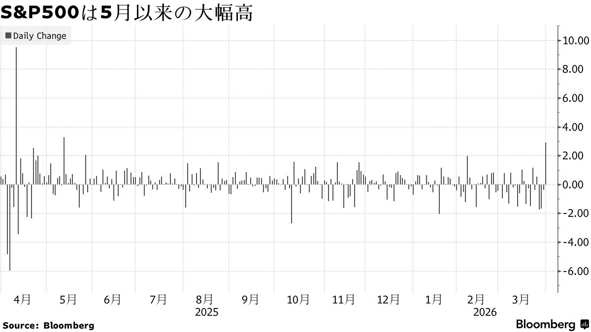 米国とイランの双方が戦争の出口を模索しているとの観測から、米国株は5月以来の大幅な値上がりとなった。S&P500種株価指数は2.9%高、ナスダック総合指数は3.8%上げた。燃料消費の多い航空株が上げを主導した。一方でエネルギー株は下落した。