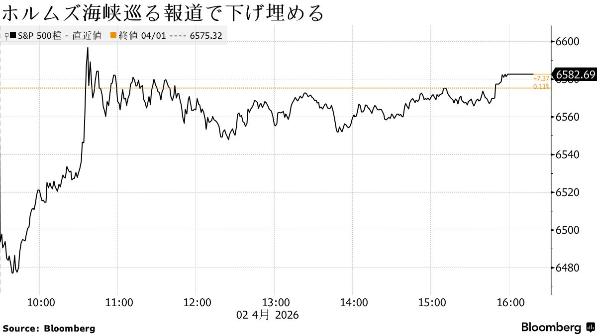 2日の米株式市場でS&P500種株価指数は小幅高。大幅安で取引を開始したが、その後下げを埋めて最終的にプラス圏で終了した。ホルムズ海峡や中東戦争を巡る新たな動きが意識された。