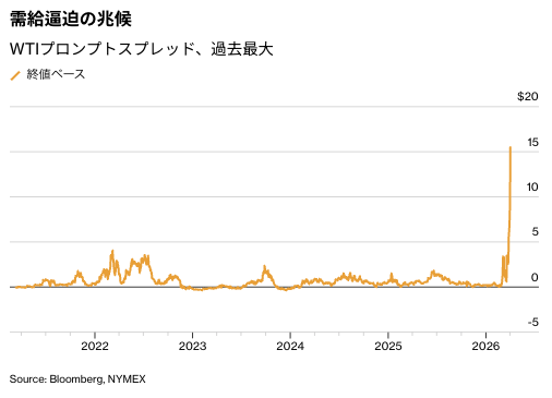 WTI原油のプロンプトスプレッド(期近物とその翌月物の価格差)は一時16ドルを超え、過去最大の価格差に達した。平時の価格差は数セントに過ぎないだけに、著しい供給逼迫(ひっぱく)が示唆されている。