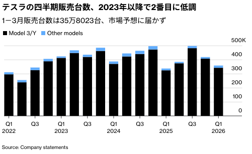 電気自動車(EV)メーカーの米テスラが2日発表した1-3月(第1四半期)の販売台数は、過去数年で最低の部類に入り、市場予想も下回った。同社は中核事業を立て直すことができず、厳しさを増すEV市場で苦戦している。