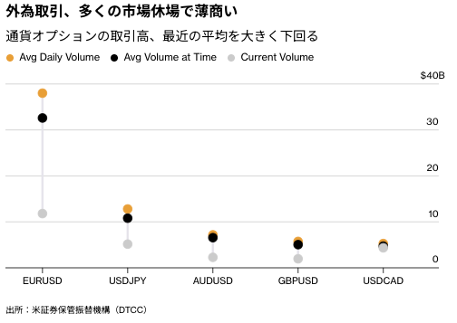 米証券保管振替機構(DTCC)によると、オプション取引高は最近の平均を約60%下回っている。多くの欧州諸国と英連邦諸国が祝日で市場は休場となっており、商いは薄い。