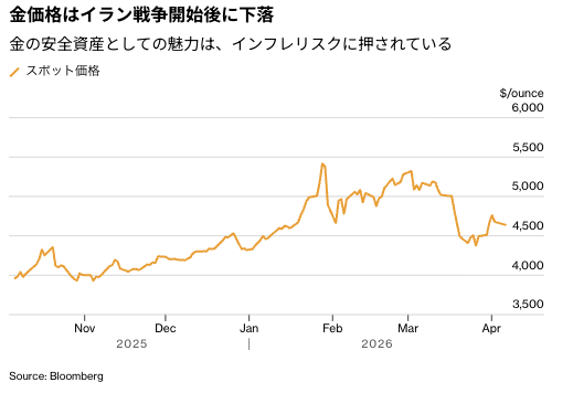 金価格は、2月末にイラン戦争が始まって以降、10%余り下落している。エネルギー価格の急騰がインフレ懸念を強め、利子を生まない金にとって追い風となる利下げ観測が後退しているためだ。また、ポートフォリオ内の他の損失を補うため、投資家が金の持ち高を手放す必要に迫られていることも背景にある。