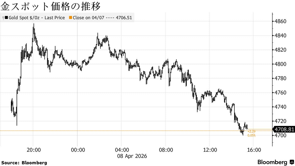 スポット価格はニューヨーク時間午後3時27分現在、前日比3.69ドル高の1オンス=4710.20ドル。ニューヨーク商品取引所(COMEX)の金先物6月限は、前日比92.50ドル(2%)高の4777.20ドルで引けた。