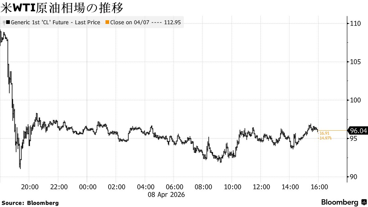 原油先物相場は大幅安。米国とイランが2週間の停戦で合意したのに続き、ホワイトハウスが米国とイランが直接協議を行うと発表したことが背景にある。
