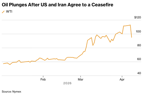 8日の米金融市場では、株式が上昇する一方で原油は約6年ぶりの大幅下落となった。米国とイランが停戦合意に達したことを受け、楽観ムードが広がった。