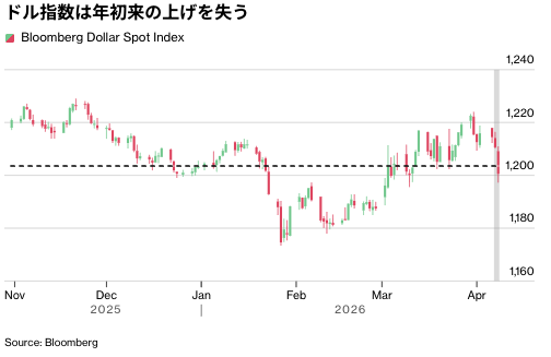 マネックスの外為トレーダー、アンドリュー・ハズレット氏は「停戦のニュースに加え、エネルギー危機への懸念後退を受けて、ドルには強い下押し圧力がかかっている」と述べた。「今後数日間の最大の焦点は、『ホルムズ海峡を通じた海運がどの程度回復するのか、そしてそれが持続的な緊張緩和につながるのかどうか』という点だ」と指摘した。