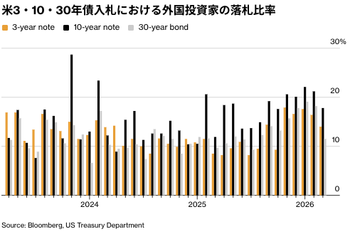 ナティクシスの米金利戦略責任者、ジョン・ブリッグス氏は「3月の入札データは1カ月分に過ぎず、この説を裏付けることも否定することもできないが、外国向け保管残高の減少は、その可能性を示唆している」と指摘した。さらに、今週の入札結果から結論を導くのは時期尚早だと付け加えた。