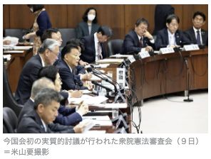 衆院憲法審査会は9日、今国会初の実質審議を開き、7党による意見表明が行われた。自民、日本維新の会、国民民主の3党は、大災害時などに国会議員任期の延長を可能にすることを柱とした緊急事態条項などについて、条文起草委員会を設置し、憲法改正原案の作成を進めるよう求めた。