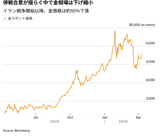 金スポット相場はもみ合い。週末に米国とイランの直接協議を控えるなか、脆弱(ぜいじゃく)な停戦合意の行方を巡って売り買いが交錯した。