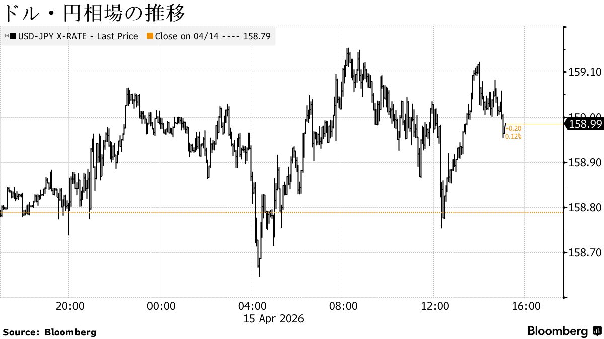15日の米金融市場では、S&P500種株価指数が1月下旬以来初めて最高値を更新した。米国とイランの和平合意に向けた期待に加え、決算シーズンが好調な滑り出しとなっており、楽観的な見方が強まった。前日急落していた原油相場は一進一退の展開となり、米国債は反落。円はリスク選好が高まる中、ドルに対して1ドル=159円前後に下落した。