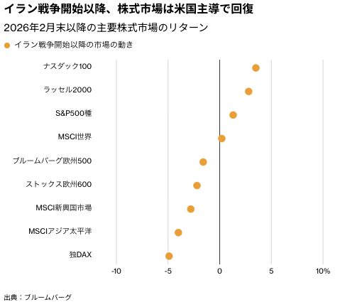 ベレンベルクのチーフエコノミスト、ホルガー・シュミーディング氏は「不確実性が続く中でも、戦争後を見据えた先行きに焦点を再び当てるのは妥当だ」と指摘。「市場を動かしている主な材料は、戦争に関連した流動性確保を急ぐ動きが一巡し、一部で反転しつつあることだ。これがリスク資産を支えている」と述べた。