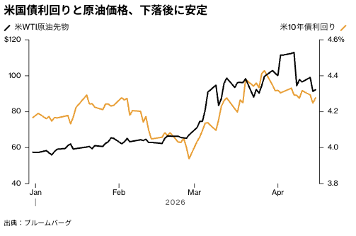 2月末のイラン戦争開始以降、原油価格は約30%上昇しており、これが米国債利回りを動かす主要因となっている。原油高に伴うガソリンの値上がりがインフレ指標を押し上げ、年内の米利下げ観測が後退した。