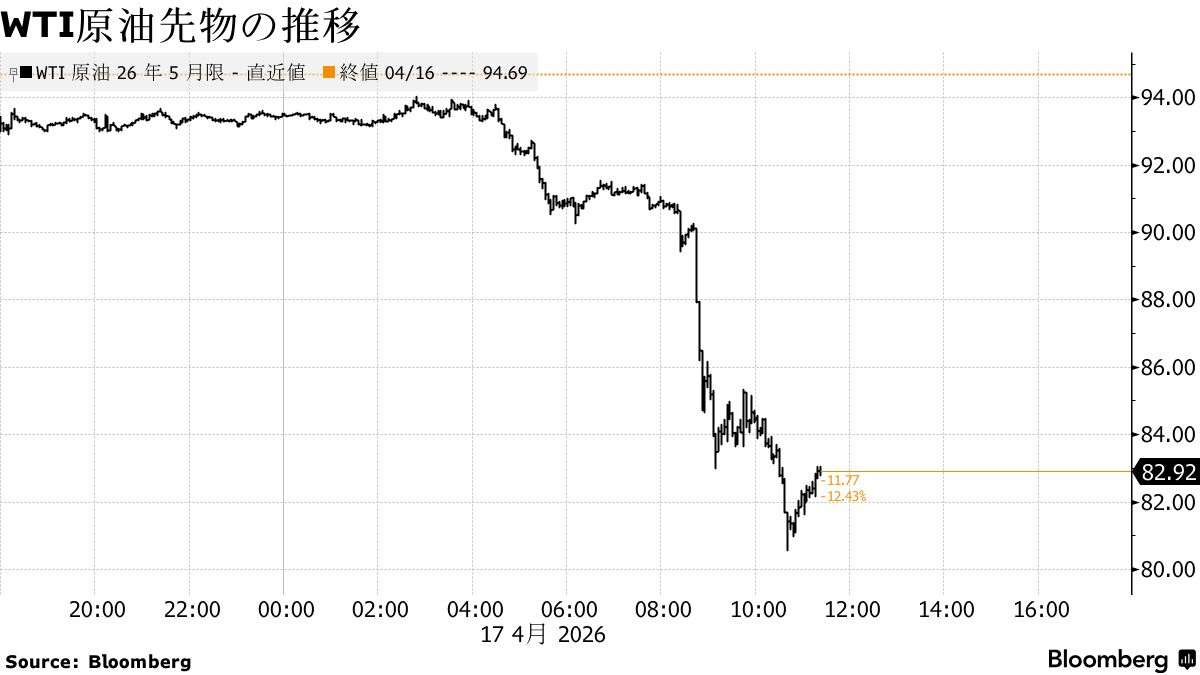 原油先物相場は急落。イランのアラグチ外相がホルムズ海峡について「完全に開放されている」と述べたことを受けて、米国とイランの紛争が終結に向かい、世界のエネルギー市場の混乱が緩和されるとの楽観が広がった。