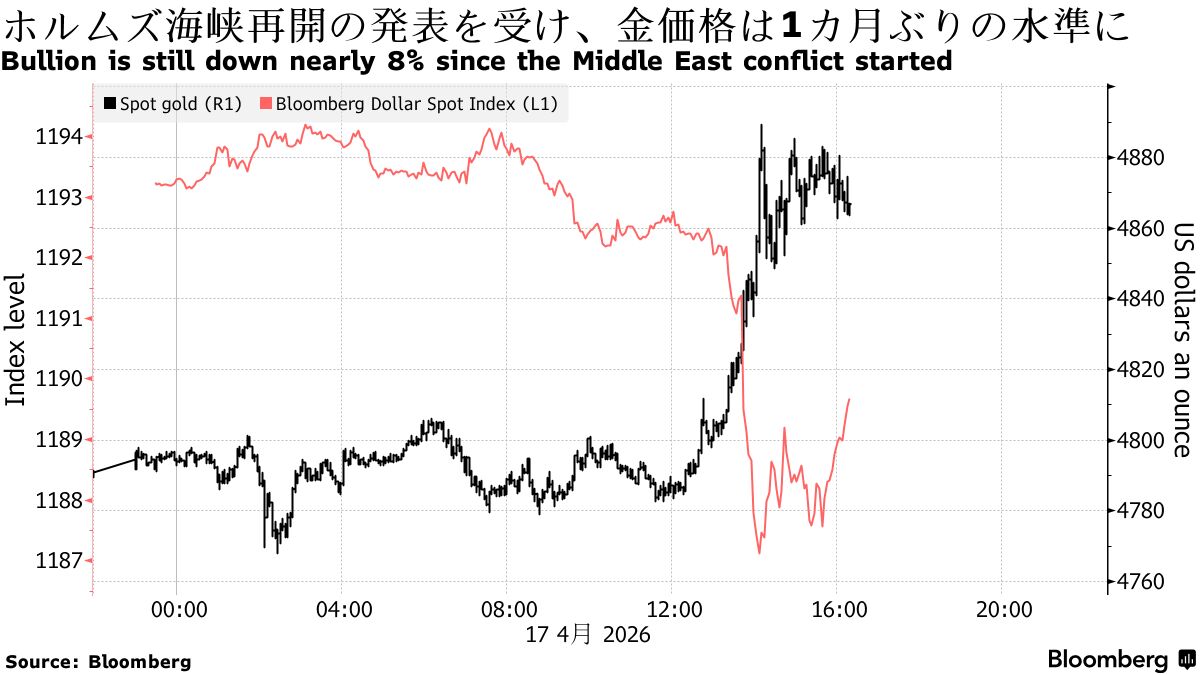 金スポット相場は反発し、約1か月ぶりの高値となった。イランがホルムズ海峡は商船に「完全に開放」されたと発表したことに反応した。銀は4.2%上昇した。