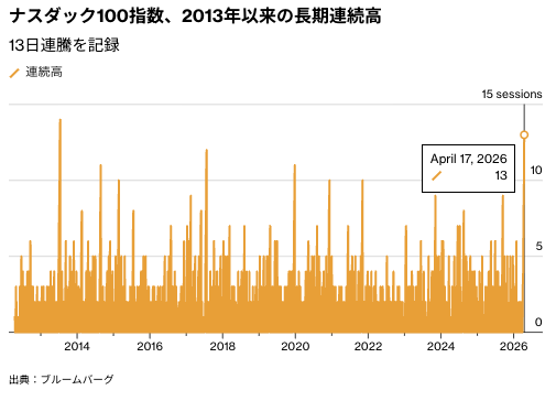 - S&P500が3日連続で最高値、ナスダック100は約13年ぶりの長期連続高