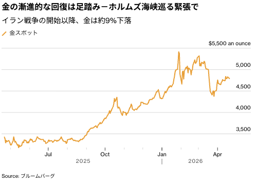 金相場は反落。週末に中東の海域で緊張が高まったことで、エネルギー供給ショックによるインフレリスクが再び意識されたほか、戦争終結に向けた協議にも不透明感が広がった。