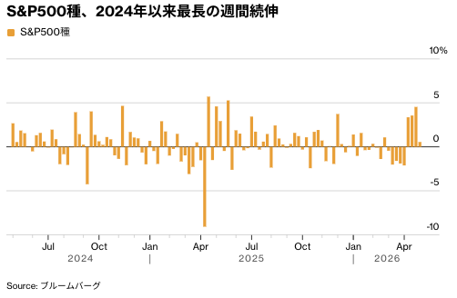 この日はナスダック100指数も最高値を更新。S&P500種は週間ベースでは4週連続高と、2024年以来最長の上昇局面となった。