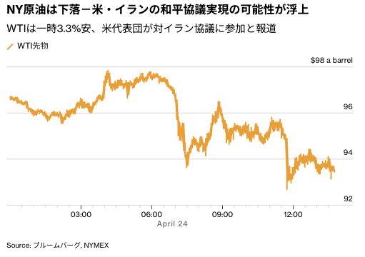 ニューヨーク原油相場は5日ぶりに下落。米国とイランの和平協議が実現する可能性が浮上し、ホルムズ海峡を通るエネルギー輸送再開への期待が高まった。