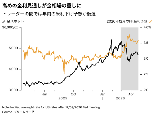 金はここ数週間、中東情勢を巡るニュースが相次ぐ中で狭いレンジで推移している。戦争の初期に投資家が現金確保のため金を売却したこともあり、戦争開始以降ではなお約10%下落している。