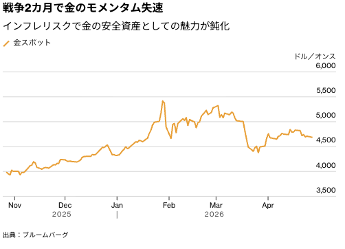 金相場は下落した。米国とイランの和平交渉再開に向けた動きが行き詰まる中、世界市場を混乱させインフレリスクを高めている戦争は開始から2カ月を迎えた状況にある。