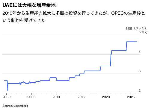 イラン戦争開始前の時点で、UAEはすでにOPECの生産枠を大きく上回る日量約370万バレルの原油を生産していた。生産能力はおそらく日量450万バレル近くに達しており、2027年末までに500万バレルの供給を可能にすることを目指している。2030年に向けて、さらに野心的な目標が近く打ち出されても不思議ではない。