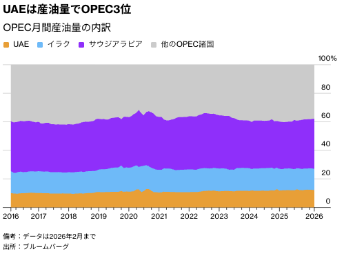 中核メンバー国の離脱はOPECに重大な打撃を与える一方、石油価格を支える取り組みを繰り返し批判してきたトランプ米大統領にとっては追い風となる。イラン戦争が起きる前のOPECでは、UAEは3番目に大きな産油国であり、全体の供給の約12%を占めていた。